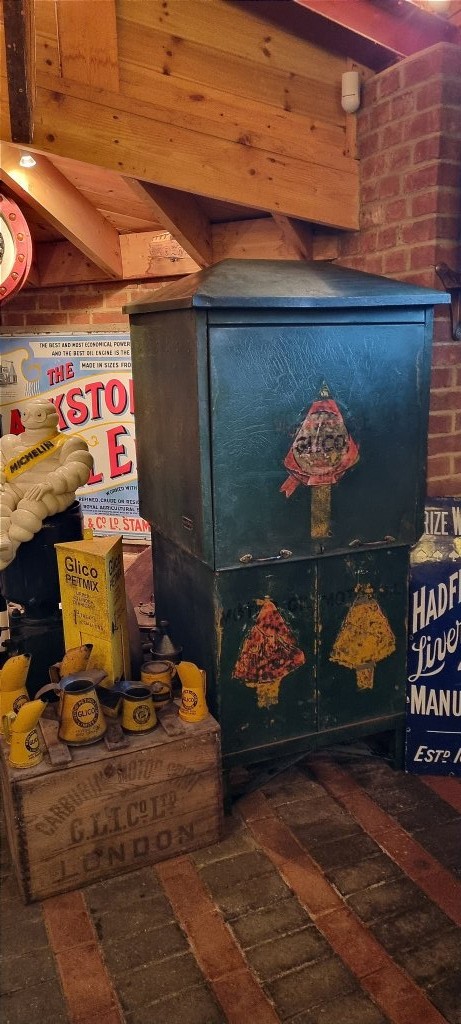 Lovely original Redline Glico graphics remaining on this early double oil cabinet, still with restored original paintwork.